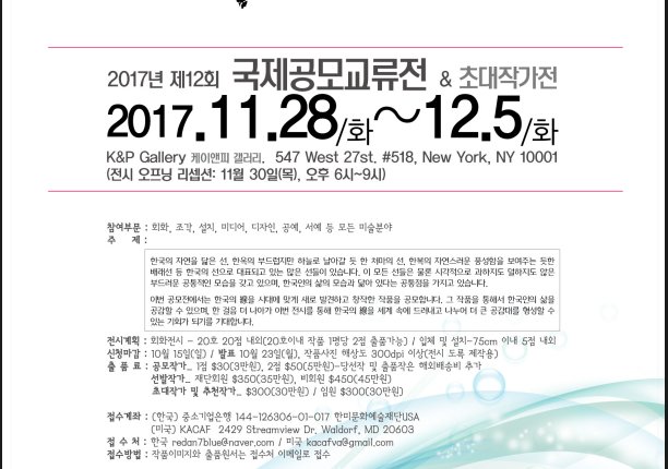 공 고 문 제12회 국제공모교류전 & 초대작가전 “한국의 선 “The Line of Korea” 한미문화예술재단은 2017년 제12회 국제공모교류전 & 초대작가전 “한국의 선 “The Line of Korea” 전시를 뉴욕 첼시에 위치한 케이엔피 갤러리에서 11월 28일 부터 12월 5일까지 갖습니다. 한국의 아름다운 선(線)을 창의적으로 해석하여 보여주는 훌륭한 작품들로 많은 참여해 주시기를 바랍니다. < 행사개요 > 전시명 : 제12회 국제공모교류전 & […]