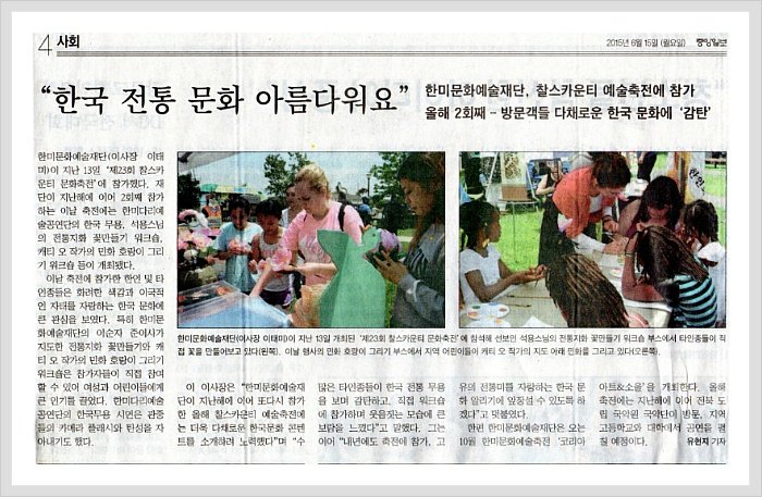 제목 : 2015년 6월 13일(토) 찰스카운티 예술축전 참가 (중앙일보 기사)