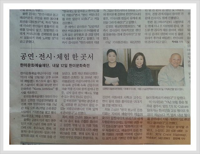 제목 : 2017년 11월 12일 제12회 워싱턴 한미문화예술축전 “Korea Art&Soul” 개최 (중앙일보 전민재 기자)