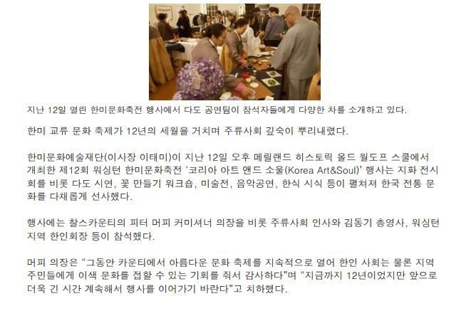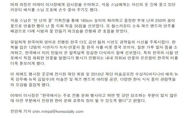 제목 : 제12회 한미문화축전 석용 스님 지화전·다도 시범·미술전 등 한국 전통문화, 주류사회에서 ‘활짝’ (중앙일보 진민재기자)