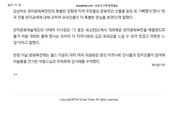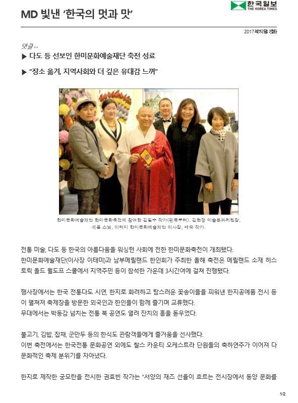 제목 : 전통 미술, 다도 등 한국의 아름다움을 워싱턴 사회에 전한 제12회 한미문화축전성료(한국일보 박지영기자)