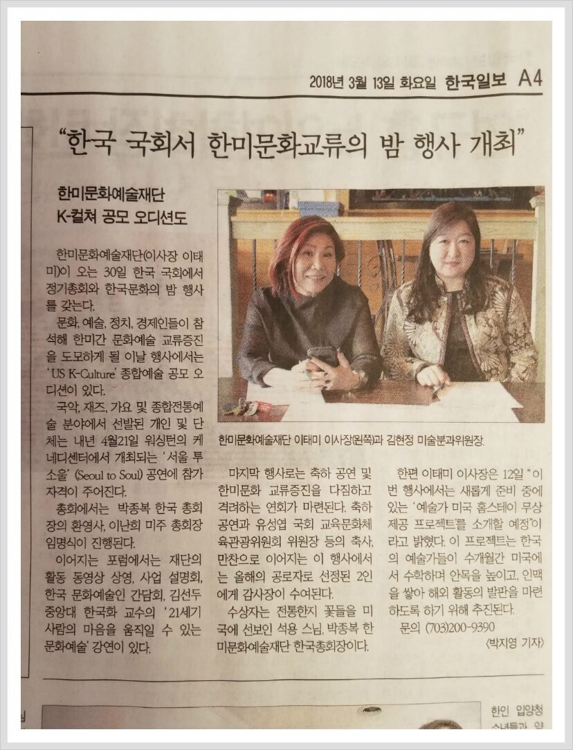 제목 : "한국국회서 한미문화교류의 밤 행사 개최" "US K-Culture" 종합예술 공모오디션(서울 투 소울 Seoul to Soul 참가자격부여)-한국일보