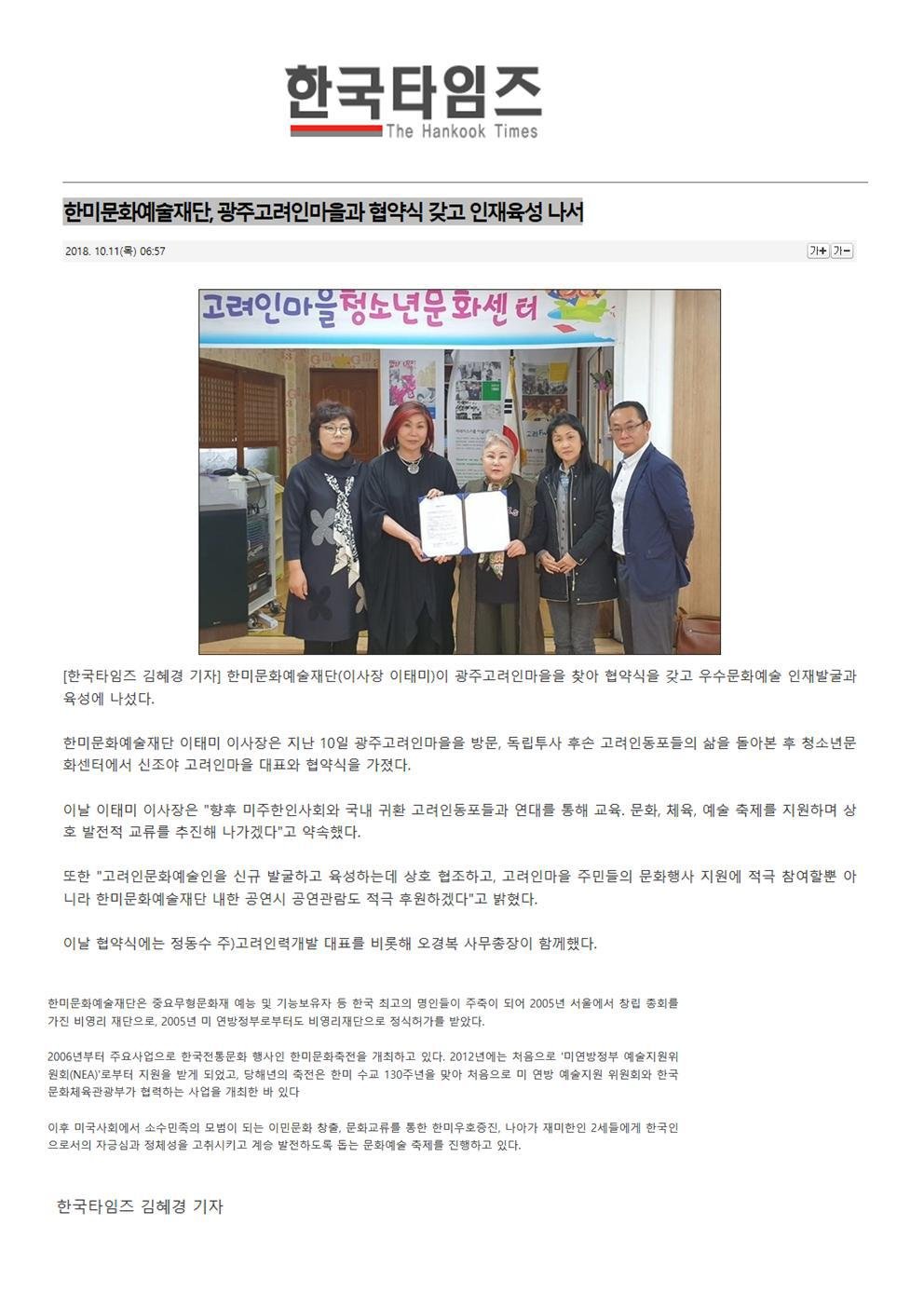 제목 : 한미문화예술재단, 광주고려인마을과 협약식 갖고 인재육성 나서 <한국타임즈 김혜경기자>