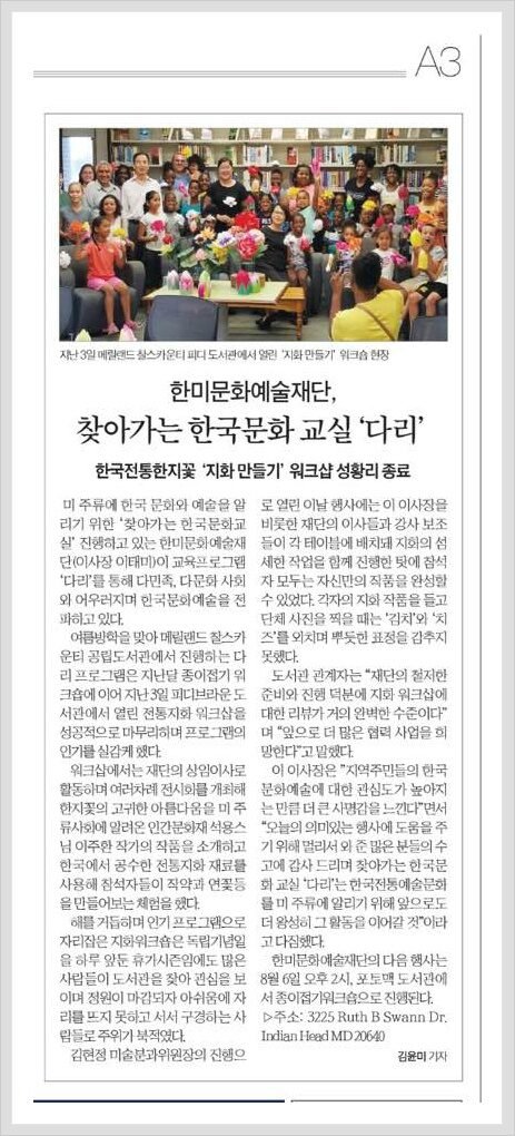 제목 : 찿아가는 한국문화교실 '다리' 한국전통한지꽃 '지화만들기' 워크샵 성황리 종료 <미주 중앙일보 7/6일 >