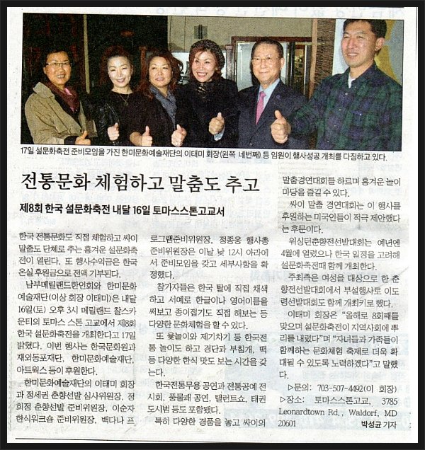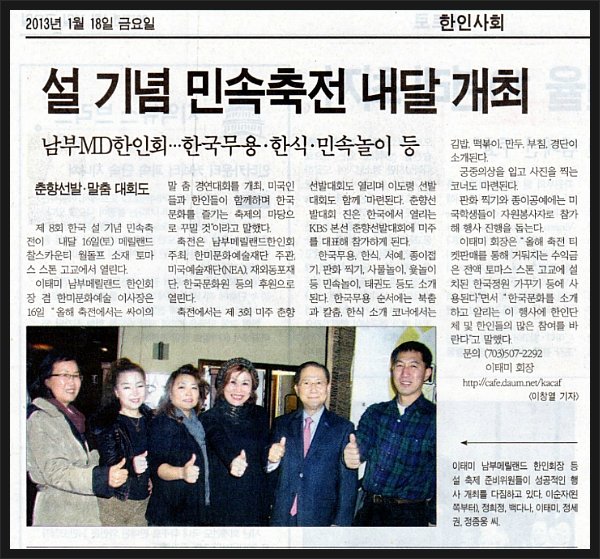 제목 : 2013년 2월 16일 제8회 한국 설 기념, "민속 축전" 중앙일보, 한국일보 기사